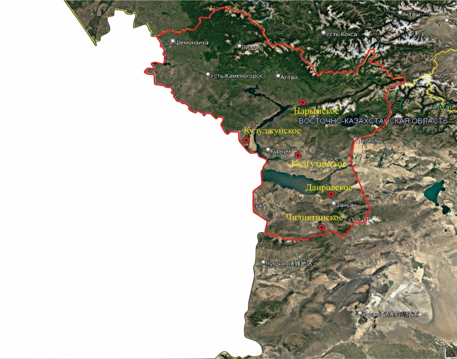 Шығыс Қазақстан облысының нақты материалы мен сынама алу нүктелерінің картасы