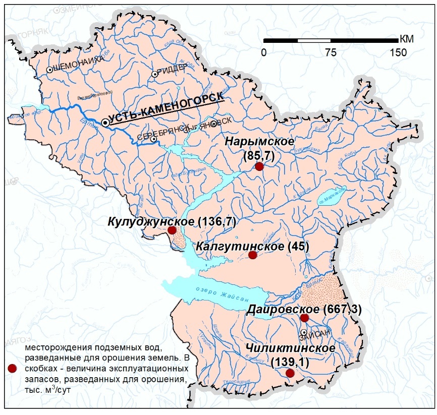 Оңтүстік және Шығыс Қазақстанның әкімшілік облыстары бойынша, сондай-ақ зерттеу аумағының 3 су шаруашылығы бассейнін жерді суару үшін барланған жерасты сулары кен орнының ресурстық әлеуетін бағалау жүргізілді. Судың суаруға жарамдылығы оның суару коэффициенттері бойынша химиялық талдауы негізінде анықталады, олардың есебі тәжірибеде белгілі әдістер бойынша жүзеге асырылады. Суару коэффициентінің шамасы бойынша жерді суару үшін барланған жер асты суларының кен орнындағы жер асты сулары суару суларына қойылатын талаптарға сәйкес келеді. Олардың көпшілігі жерді суаруға да, ірі орталықтандырылған шаруашылық-ауыз сумен қамтамасыз етуге де жарамды.