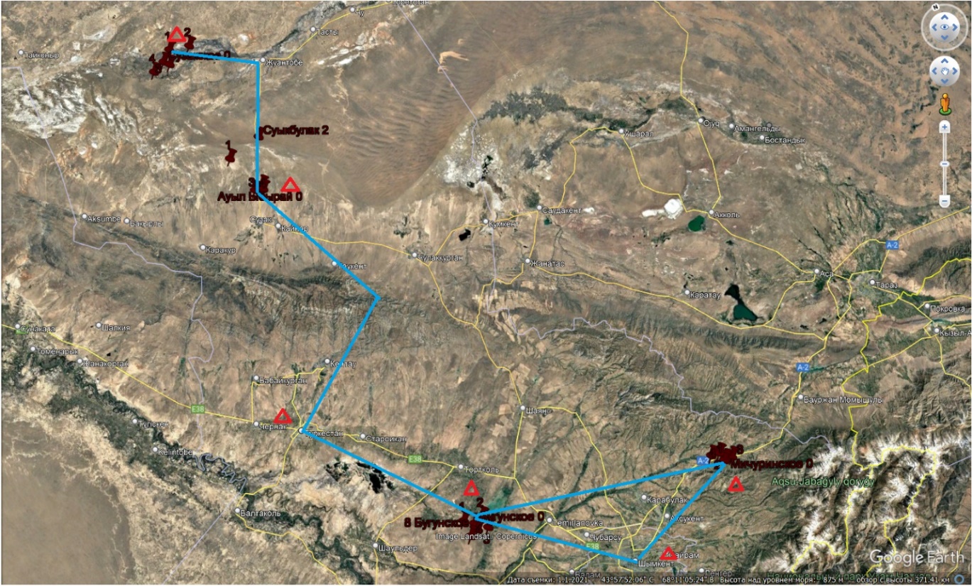 Түркістан облысының нақты материалы мен сынама алу нүктелерінің картасы