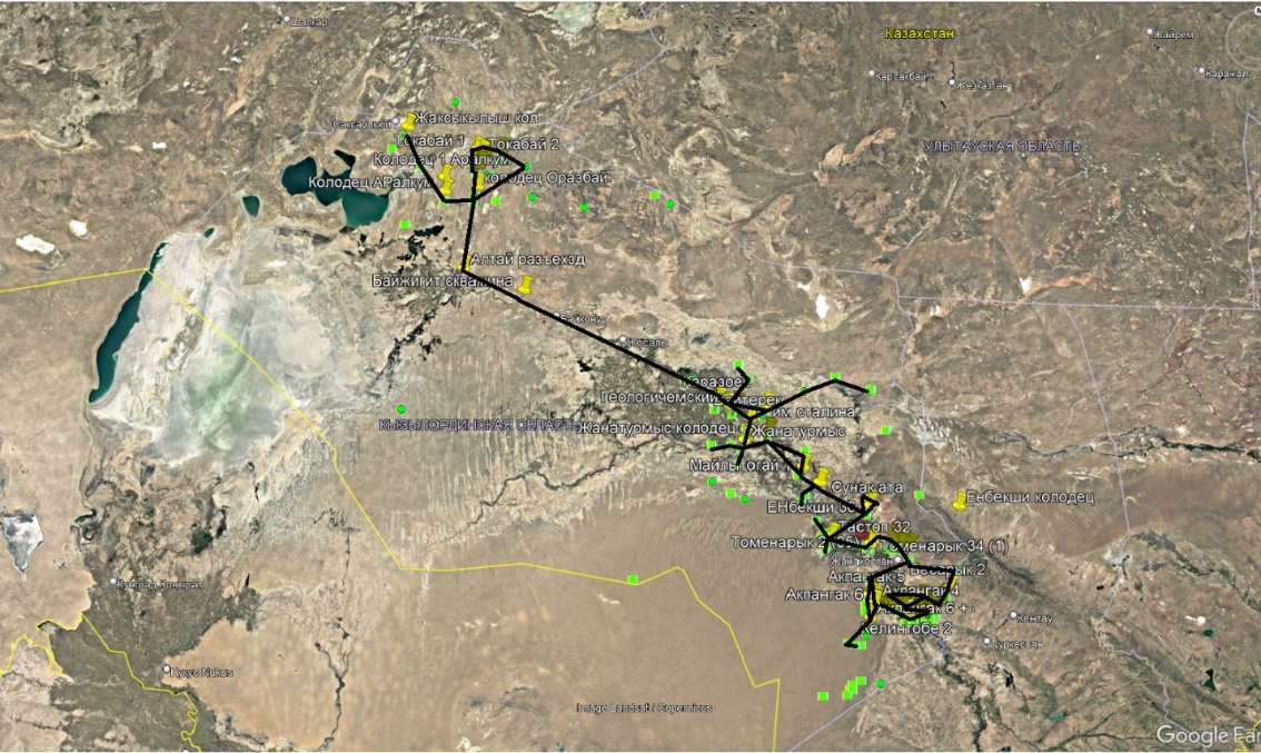 Қызылорда облысының аумағындағы нақты материалдың картасы және сынама алу нүктелері